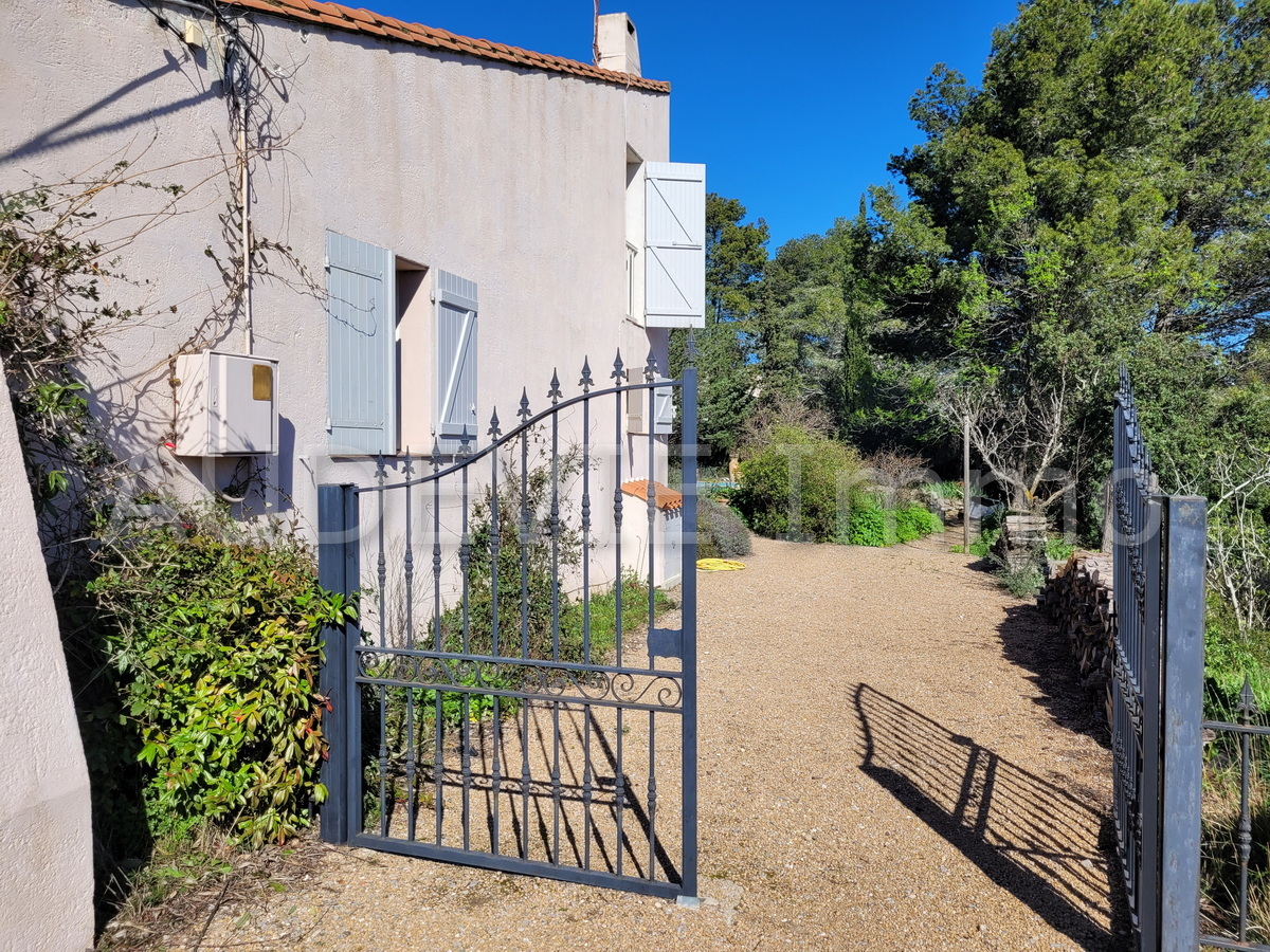 Het 3.400 m² perceel is niet omheind, is vlak rondom het huis en zwembad, en loopt vervolgens gedeeltelijk hellend af in een omgeving van garrigue en heuvels.