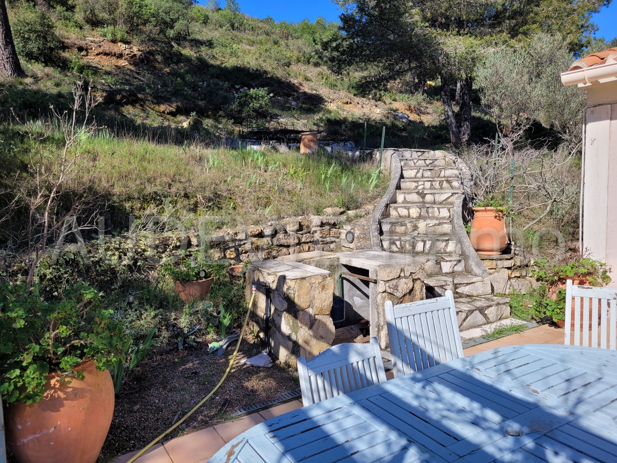 Buiten is er een groot zuidgericht terras van ca. 65 m² met pergola, een zwembad van 10 × 5 m, omgeven door mediterrane vegetatie. Het perceel is gedeeltelijk vlak, gedeeltelijk hellend, met ruime parkeerplek.